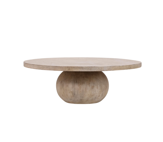 The beautifully curved reclaimed pine wood top of this coffee table perfectly harmonizes with the circular shape of its wood base. The light warm washed and natural finish works great with any casual lifestyle.