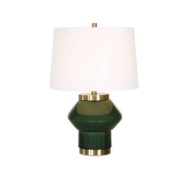 The Tayson Table Lamp showcases a jade green ceramic base accented with antique brass plated details, blending striking design with contemporary elegance. The tapered hardback shade is covered in a crisp white linen fabric.